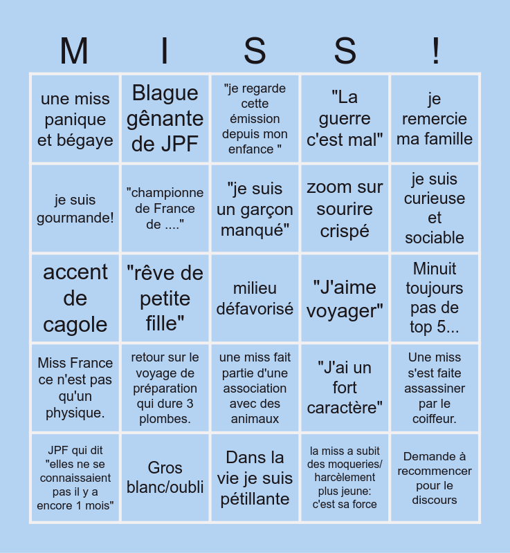 This bingo card has 64 words: "Je suis curieuse et j'aime faire des rencontres", Une miss se gaufre., ma région n'a pas gagné depuis… (ou jamais), Une miss s'est faite assassiner par le coiffeur., Une miss en école de commerce, Larmes, Blague gênante de JPF, Miss complètement paumée pendant une choré, "je suis un garçon manqué", Une miss en BTS communication, une miss fait partie d'une association avec des animaux, Un bel accent de cagole, Minuit toujours pas de top 5..., je remercie ma famille, costumes régionaux WTF, je suis gourmande!, "rêve de petite fille", une miss panique et bégaye, Un accent régional à couper au couteau, zoom sur sourire crispé, retour sur le voyage de préparation qui dure 3 plombes., Miss France ce n'est pas qu'un physique., "La guerre c'est mal", "Bonsoir la France !", "J'aime voyager", blague avec l'huissier, "les votes sont très serrés", le choix est compliqué, miss sabotée par la mise en beauté, une miss parle en patois régional, zoom sur des seins / fesses, j'aime les animaux, "femme forte et indépendante ", la bienveillance est ma qualité première, je suis curieuse et sociable, JPF qui dit "elles ne se connaissaient pas il y a encore 1 mois", la miss est sportive, la miss a subit des moqueries/ harcèlement plus jeune: c'est sa force, une miss fait un jeu de mot avec son nom/prénom, "championne de France de ....", accent de cagole, "J'aime voyager", retour sur le quizz de culture G, Promo incessante pour le Futuroscope / Raffararin guest star, "Miss France ce n'est pas qu'un physique", milieu défavorisé, Gros blanc/oubli, Demande à recommencer pour le discours, "J'ai un fort caractère", "Rêve de petite fille", Egalité Homme/Femme, Mes amis disent de moi...., Dans la vie je suis pétillante, JP qui coupe la parole ou se l'a fait couper, faire découvrir mon île aux Français, "je suis en x -ème année d'une formation commerciale / marketing/ BTS management international", "je regarde cette émission depuis mon enfance ", j'aimerais intégrer le monde de la télé, "je suis proche de la nature'', J'aime les animaux, « donnez moi la chance de vous représenter pendant une année », "je souhaite porter haut les couleurs de ma région", je suis plus basket que talons and Citation.