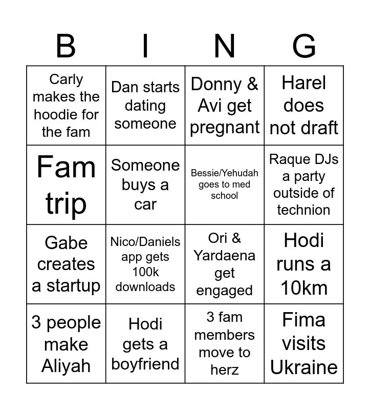 This bingo card has 16 words: 3 people make Aliyah, Hodi gets a boyfriend, Donny & Avi get pregnant, Harel does not draft, Fam trip, Dan starts dating someone, Ori & Yardaena get engaged, Hodi runs a 10km, Carly makes the hoodie for the fam, Someone buys a car, 3 fam members move to herz, Raque DJs a party outside of technion, Gabe creates a startup, Nico/Daniels app gets 100k downloads, Bessie/Yehudah goes to med school and Fima visits Ukraine.