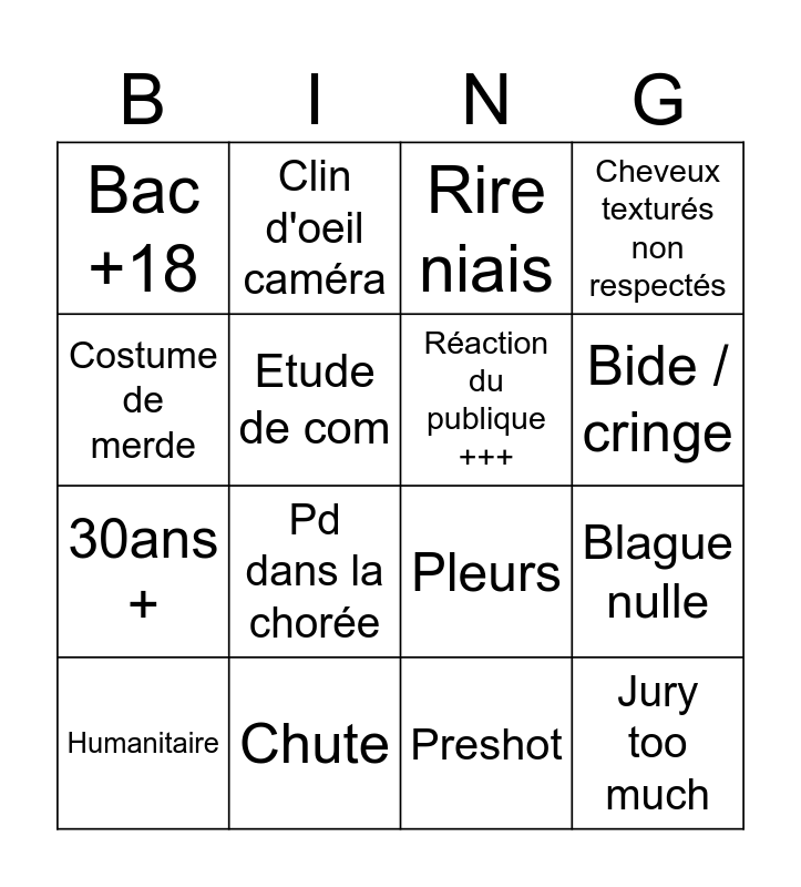 This bingo card has 16 words: Chute, Blague nulle, Rire niais, Bac +18, 30ans +, Clin d'oeil caméra, Pleurs, Preshot, Costume de merde, Etude de com, Humanitaire, Cheveux texturés non respectés, Pd dans la chorée, Bide / cringe, Réaction du publique +++ and Jury too much.