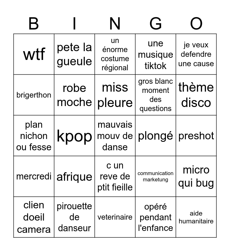 This bingo card has a free space and 24 words: afrique, pirouette de danseur, miss pleure, clien doeil camera, je veux defendre une cause, wtf, brigerthon, pete la gueule, plongé, c un reve de ptit fieille, gros blanc moment des questions, plan nichon ou fesse, communication marketung, micro qui bug, robe moche, opéré pendant l'enfance, preshot, un énorme costume régional, thème disco, kpop, aide humanitaire, mercredi, une musique tiktok and veterinaire.
