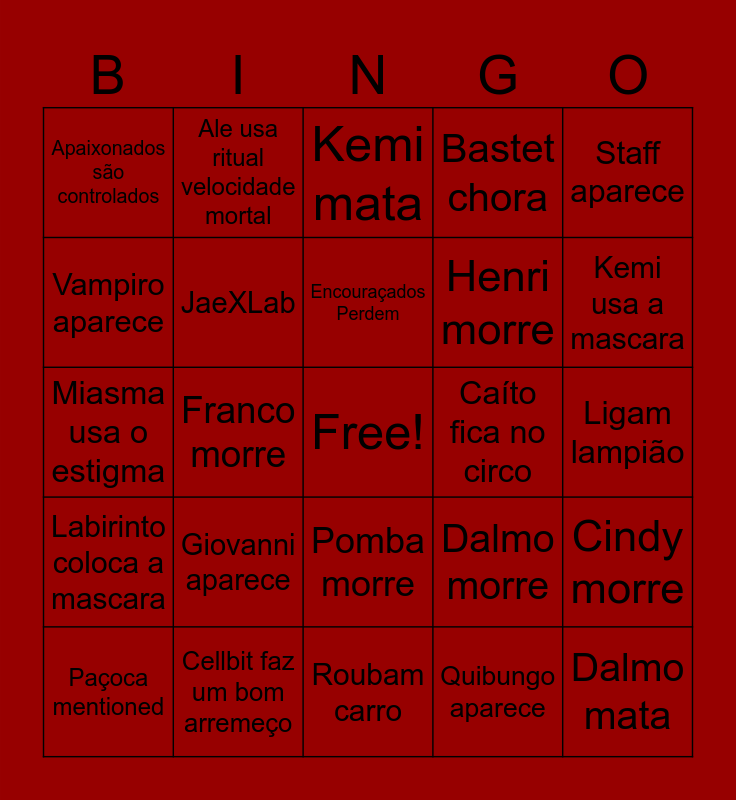 This bingo card has a free space and 24 words: Giovanni aparece, Cellbit faz um bom arremeço, Encouraçados Perdem, Paçoca mentioned, Staff aparece, Apaixonados são controlados, Vampiro aparece, Ale usa ritual velocidade mortal, Caíto fica no circo, Pomba morre, Henri morre, Miasma usa o estigma, Dalmo morre, Cindy morre, JaeXLab, Quibungo aparece, Ligam lampião, Kemi mata, Kemi usa a mascara, Franco morre, Dalmo mata, Labirinto coloca a mascara, Bastet chora and Roubam carro.