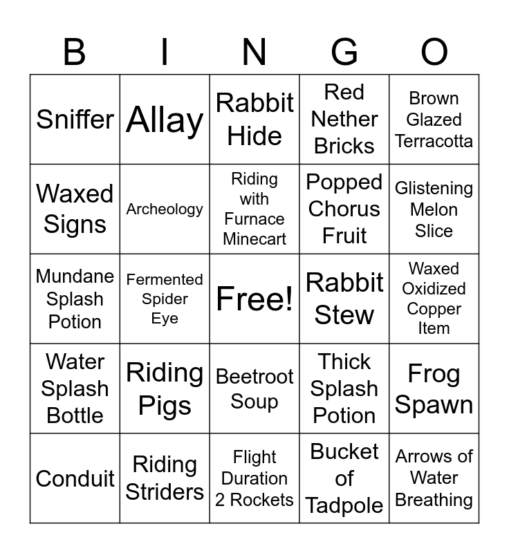 This bingo card has a free space and 24 words: Riding Pigs, Riding Striders, Riding with Furnace Minecart, Conduit, Brown Glazed Terracotta, Sniffer, Waxed Signs, Allay, Rabbit Stew, Beetroot Soup, Popped Chorus Fruit, Mundane Splash Potion, Thick Splash Potion, Frog Spawn, Archeology, Bucket of Tadpole, Waxed Oxidized Copper Item, Rabbit Hide, Glistening Melon Slice, Fermented Spider Eye, Arrows of Water Breathing, Water Splash Bottle, Red Nether Bricks and Flight Duration 2 Rockets.