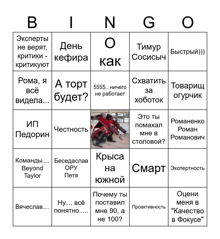 This bingo card has a free space and 24 words: Беседаслав ОРУ Петя, Ну.... всё понятно....., 5555...ничего не работает, Вячеслав...., Быстрый))), Эксперты не верят, критики - критикуют, Рома, я всё видела..., День кефира, Это ты помахал мне в столовой?, Крыса на южной, Схватить за хоботок, ИП Педорин, Смарт, Экспертность, А торт будет?, Проактивность, Романенко Роман Романович, О как, Товарищ огурчик, Честность, Оцени меня в "Качество в Фокусе", Команды.... Beyond Taylor, Тимур Сосисыч and Почему ты поставил мне 90, а не 100?.