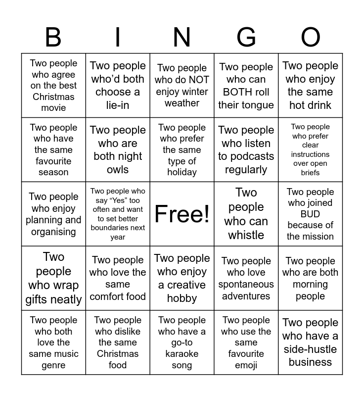 This bingo card has a free space and 24 words: Two people who love the same comfort food, Two people who dislike the same Christmas food, Two people who prefer the same type of holiday, Two people who both love the same music genre, Two people who enjoy the same hot drink, Two people who agree on the best Christmas movie, Two people who have the same favourite season, Two people who’d both choose a lie-in, Two people who can whistle, Two people who enjoy a creative hobby, Two people who listen to podcasts regularly, Two people who enjoy planning and organising, Two people who love spontaneous adventures, Two people who are both morning people, Two people who are both night owls, Two people who use the same favourite emoji, Two people who joined BUD because of the mission, Two people who do NOT enjoy winter weather, Two people who prefer clear instructions over open briefs, Two people who say “Yes” too often and want to set better boundaries next year, Two people who have a side-hustle business, Two people who wrap gifts neatly, Two people who can BOTH roll their tongue and Two people who have a go-to karaoke song.