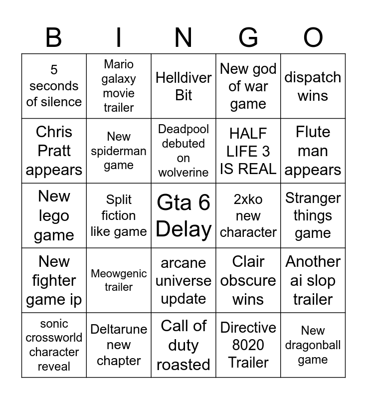 This bingo card has 25 words: Meowgenic trailer, Call of duty roasted, Deadpool debuted on wolverine, sonic crossworld character reveal, dispatch wins, 5 seconds of silence, Chris Pratt appears, Mario galaxy movie trailer, 2xko new character, arcane universe update, HALF LIFE 3 IS REAL, New lego game, Clair obscure wins, Another ai slop trailer, New spiderman game, New dragonball game, Stranger things game, Helldiver Bit, Flute man appears, Split fiction like game, Gta 6 Delay, Deltarune new chapter, New fighter game ip, New god of war game and Directive 8020 Trailer.