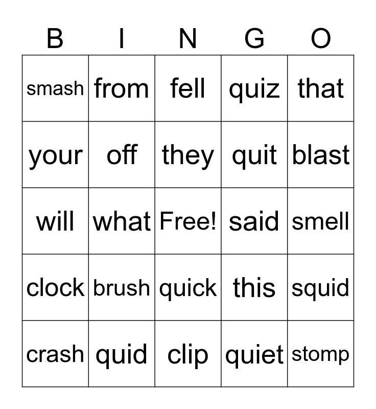 This bingo card has a free space and 24 words: brush, quid, they, crash, that, smash, your, from, said, quick, quit, will, this, squid, off, quiet, smell, fell, blast, what, stomp, clock, quiz and clip.