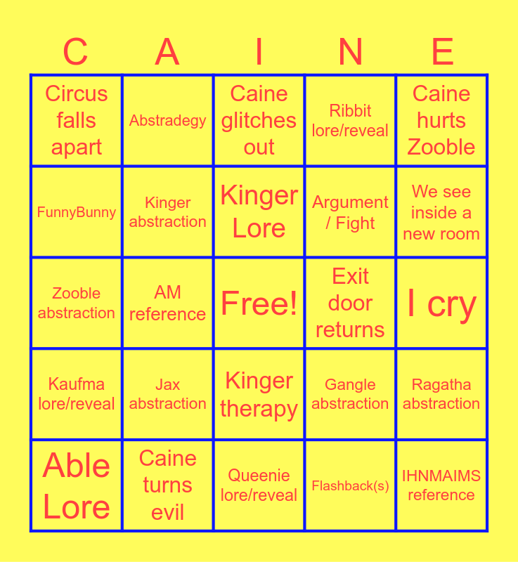 This bingo card has a free space and 24 words: Jax abstraction, Caine turns evil, Kinger Lore, Able Lore, Caine hurts Zooble, Circus falls apart, FunnyBunny, Abstradegy, Exit door returns, Kinger therapy, Argument / Fight, Zooble abstraction, Gangle abstraction, Ragatha abstraction, Kinger abstraction, Flashback(s), I cry, Caine glitches out, We see inside a new room, AM reference, IHNMAIMS reference, Kaufma lore/reveal, Ribbit lore/reveal and Queenie lore/reveal.
