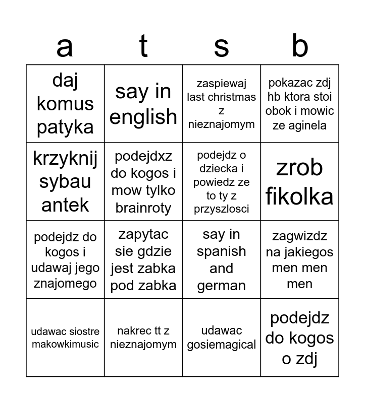 This bingo card has 16 words: nakrec tt z nieznajomym, zagwizdz na jakiegos men men men, zaspiewaj last christmas z nieznajomym, daj komus patyka, podejdz do kogos i udawaj jego znajomego, say in english, say in spanish and german, udawac gosiemagical, krzyknij sybau antek, podejdxz do kogos i mow tylko brainroty, udawac siostre makowkimusic, pokazac zdj hb ktora stoi obok i mowic ze aginela, zapytac sie gdzie jest zabka pod zabka, zrob fikolka, podejdz o dziecka i powiedz ze to ty z przyszlosci and podejdz do kogos o zdj.