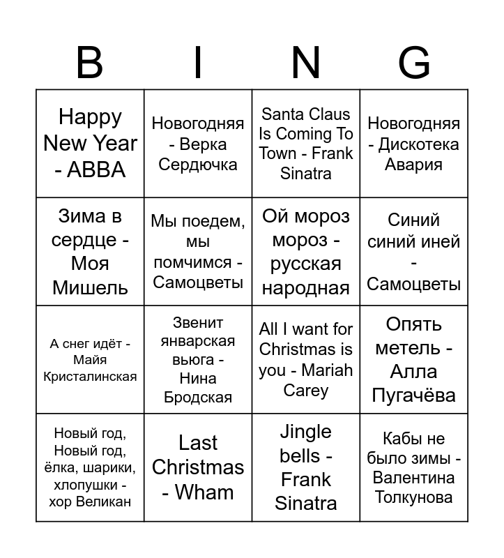 This bingo card has 40 words: С Новым годом, крошка - Мумий тролль, Мы поедем, мы помчимся - Самоцветы, Зима холода - Андрей Губин, Кабы не было зимы - Валентина Толкунова, Новый год, Новый год, ёлка, шарики, хлопушки - хор Великан, «Снежинка» из м/ф «Чародеи», Ой мороз мороз - русская народная, «Расскажи снегурочка, где была» из м/ф «Ну-погоди!», Happy New Year - ABBA, Last Christmas - Wham, Снег кружится - ВИА Пламя, Синий синий иней - Самоцветы, Зима в сердце - Моя Мишель, Звенит январская вьюга - Нина Бродская, Белая зима - София Ротару, Jingle bell rock - Bobby Helms, Новогодняя песня - Блестящие, Новогодняя - Верка Сердючка, Зима в избушке - Эдуард Хиль, Новогодняя - Дискотека Авария, А снег идёт - Майя Кристалинская, Новогодние игрушки, свечи и хлопушки в нём - Самоцветы, All I want for Christmas is you - Mariah Carey, Опять метель - Алла Пугачёва, Пять минут - Людмила Гурченко, Let it snow - Frank Sinatra, Белые медведи - Аида Ведищева, We wish you a marry Christmas - Enya, Новый год - Стекловата, Rockin’ Around the Christmas Tree - Brenda Lee, Три белых коня из к/ф «Чародеи», Magic moments - Perry Como, Снег идёт из к/ф Старый новый год, Snowman - Sia, Jingle bells - Frank Sinatra, С Новым годом - Фабрика звезд 3, Заметает зима - Слава, Снег - Татьяна Буланова, Santa Claus Is Coming To Town - Frank Sinatra and Последний час декабря - Бит-квартет.