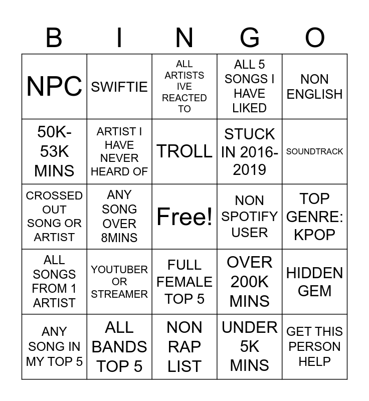 This bingo card has a free space and 24 words: YOUTUBER OR STREAMER, ALL BANDS TOP 5, TROLL, ANY SONG IN MY TOP 5, NON ENGLISH, NPC, 50K-53K MINS, SWIFTIE, NON SPOTIFY USER, FULL FEMALE TOP 5, STUCK IN 2016-2019, CROSSED OUT SONG OR ARTIST, OVER 200K MINS, HIDDEN GEM, ARTIST I HAVE NEVER HEARD OF, UNDER 5K MINS, TOP GENRE: KPOP, ALL ARTISTS IVE REACTED TO, SOUNDTRACK, ANY SONG OVER 8MINS, GET THIS PERSON HELP, ALL SONGS FROM 1 ARTIST, ALL 5 SONGS I HAVE LIKED and NON RAP LIST.