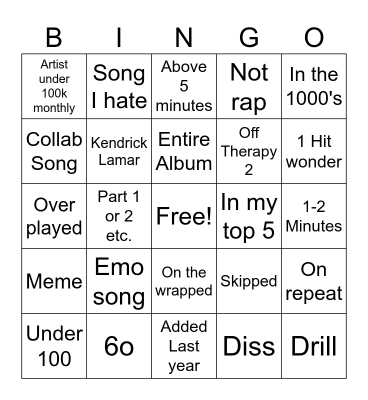 This bingo card has a free space and 24 words: Emo song, 6o, Entire Album, Under 100, In the 1000's, Artist under 100k monthly, Collab Song, Song I hate, In my top 5, On the wrapped, Off Therapy 2, Over played, Skipped, On repeat, Kendrick Lamar, Diss, 1-2 Minutes, Above 5 minutes, 1 Hit wonder, Part 1 or 2 etc., Drill, Meme, Not rap and Added Last year.