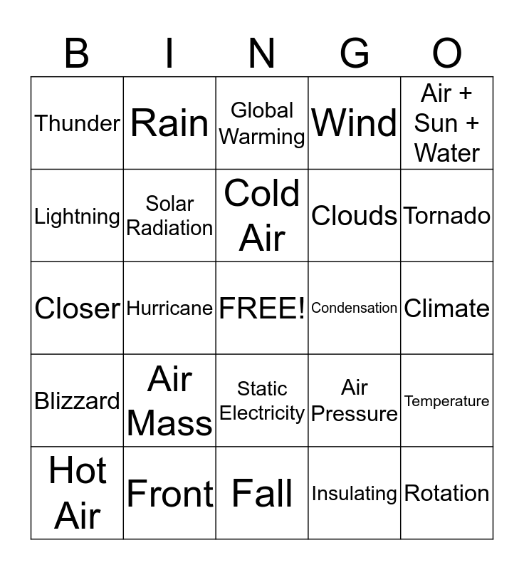 This bingo card has a free space and 24 words: Air Mass, Front, Cold Air, Hot Air, Air + Sun + Water, Thunder, Lightning, Rain, Condensation, Static Electricity, Clouds, Closer, Air Pressure, Temperature, Solar Radiation, Insulating, Climate, Global Warming, Tornado, Hurricane, Rotation, Blizzard, Wind and Fall.