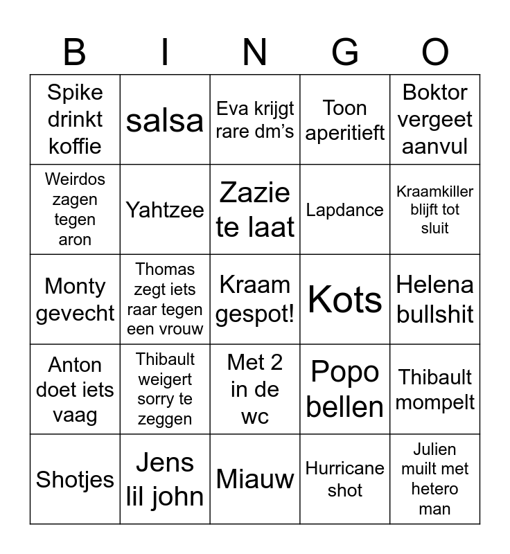 This bingo card has a free space and 24 words: Thibault weigert sorry te zeggen, Jens lil john, Zazie te laat, Shotjes, Boktor vergeet aanvul, Spike drinkt koffie, Weirdos zagen tegen aron, salsa, Kots, Met 2 in de wc, Lapdance, Monty gevecht, Popo bellen, Thibault mompelt, Yahtzee, Hurricane shot, Helena bullshit, Eva krijgt rare dm’s, Kraamkiller blijft tot sluit, Thomas zegt iets raar tegen een vrouw, Julien muilt met hetero man, Anton doet iets vaag, Toon aperitieft and Miauw.
