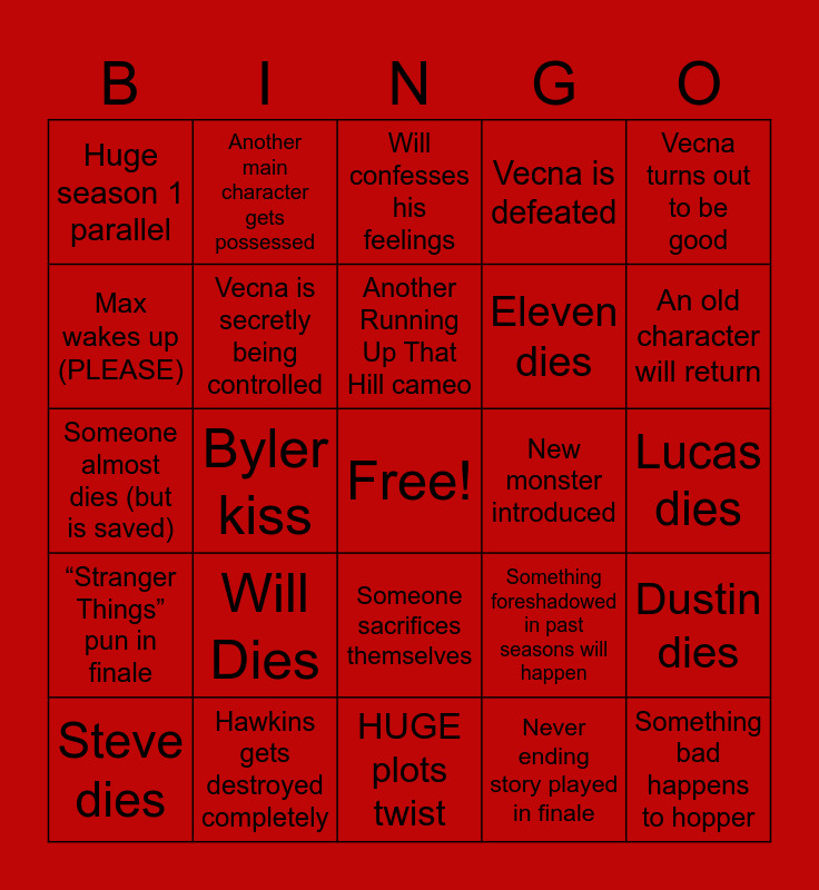 This bingo card has a free space and 24 words: Will Dies, Hawkins gets destroyed completely, Another Running Up That Hill cameo, Steve dies, Vecna turns out to be good, Huge season 1 parallel, Max wakes up (PLEASE), Another main character gets possessed, New monster introduced, Someone sacrifices themselves, Eleven dies, Someone almost dies (but is saved), Something foreshadowed in past seasons will happen, Dustin dies, Vecna is secretly being controlled, Never ending story played in finale, Lucas dies, Will confesses his feelings, An old character will return, Byler kiss, Something bad happens to hopper, “Stranger Things” pun in finale, Vecna is defeated and HUGE plots twist.