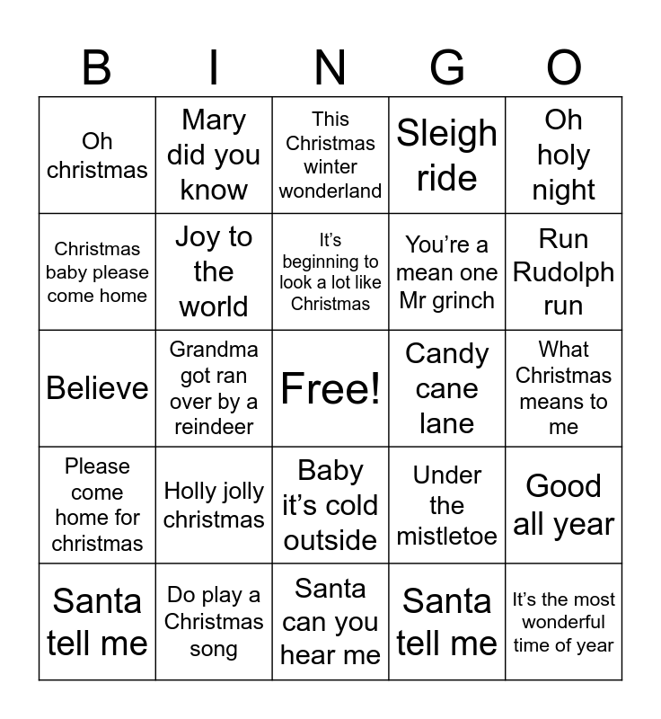 This bingo card has a free space and 25 words: Holly jolly christmas, Santa can you hear me, It’s beginning to look a lot like Christmas, Santa tell me, Oh holy night, Oh christmas, Christmas baby please come home, Mary did you know, Candy cane lane, Baby it’s cold outside, You’re a mean one Mr grinch, Believe, Under the mistletoe, Good all year, Joy to the world, Maybe this christmas, What Christmas means to me, This Christmas winter wonderland, Run Rudolph run, Grandma got ran over by a reindeer, It’s the most wonderful time of year, Do play a Christmas song, Please come home for christmas, Sleigh ride and Santa tell me.