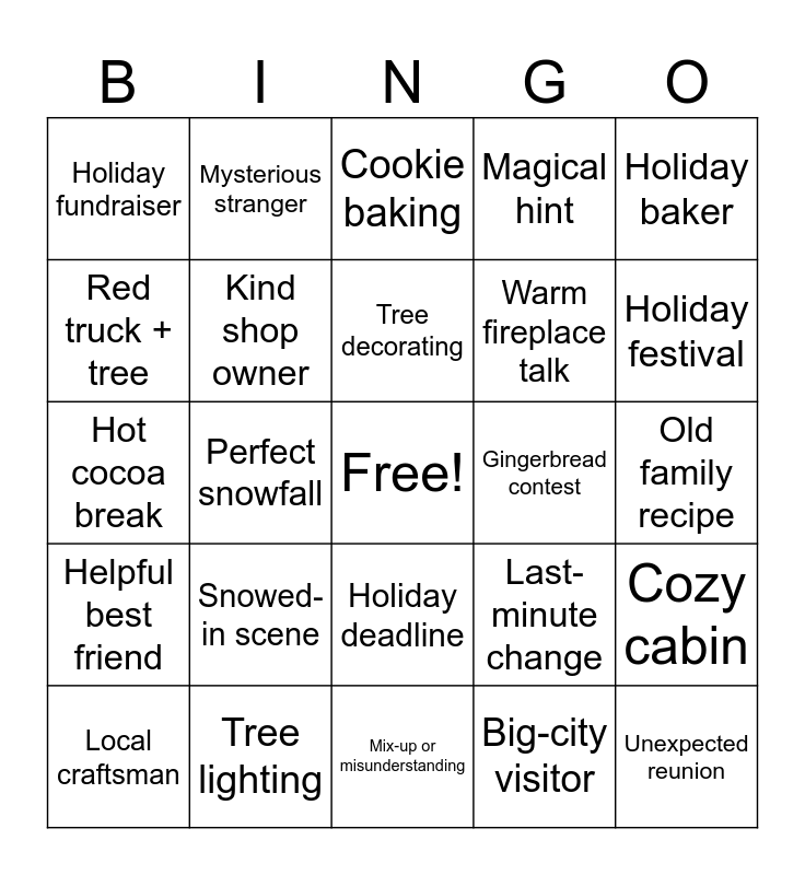 This bingo card has a free space and 34 words: Holiday small town, Big-city visitor, Hometown crush, Single parent, Helpful best friend, Kind shop owner, Holiday baker, Local craftsman, Mysterious stranger, Cheerful child, Tree decorating, Cookie baking, Ice skating, Snowball moment, Gingerbread contest, Holiday festival, Tree lighting, Hot cocoa break, Snowed-in scene, Last-minute change, Holiday deadline, Save the shop, Holiday fundraiser, Old family recipe, Mix-up or misunderstanding, Unexpected reunion, Magical hint, Town tradition, Warm fireplace talk, Red truck + tree, Matching scarves, Perfect snowfall, Cozy cabin and Holiday confession.