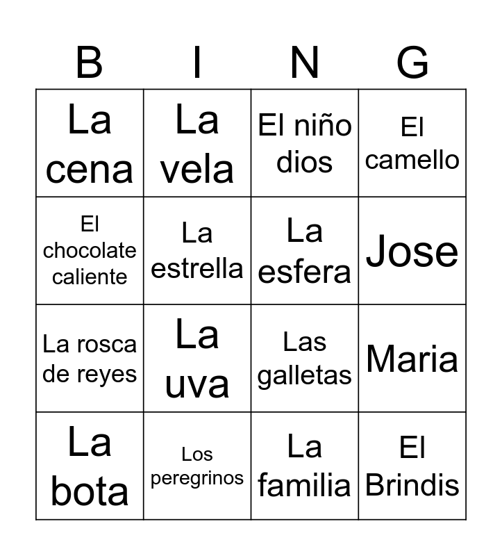 This bingo card has 51 words: Arbol de navidad, La bota, La campana, Los reyes magos, Santa claus, El reno, La vela, La piñata, La estrella, El muñeco de nieve, La esfera, El camello, El regalo, El trineo, El ángel, El copo, Jose, Los peregrinos, El nacimiento, El chocolate caliente, Maria, La noche buena, La cena, La rosca de reyes, El burrito sabanero, Las luces, La uva, Los tamales, La posada, El niño dios, Los buñuelos, El ponche, El pavo, La carta, El polo norte, La bufanda, Los guantes, El gorro, La paz, El amor, La familia, El Brindis, El año nuevi, El grich, La chimenea, El sueter, Las galletas, Los juguetes, El calendario, El villancico and El bastón de dulce.