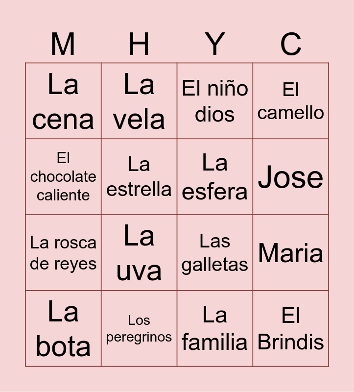 This bingo card has 51 words: Arbol de navidad, La bota, La campana, Los reyes magos, Santa claus, El reno, La vela, La piñata, La estrella, El muñeco de nieve, La esfera, El camello, El regalo, El trineo, El ángel, El copo, Jose, Los peregrinos, El nacimiento, El chocolate caliente, Maria, La noche buena, La cena, La rosca de reyes, El burrito sabanero, Las luces, La uva, Los tamales, La posada, El niño dios, Los buñuelos, El ponche, El pavo, La carta, El polo norte, La bufanda, Los guantes, El gorro, La paz, El amor, La familia, El Brindis, El año nuevi, El grich, La chimenea, El sueter, Las galletas, Los juguetes, El calendario, El villancico and El bastón de dulce.