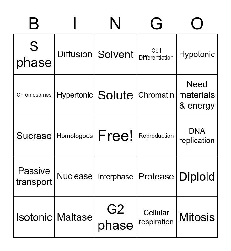This bingo card has a free space and 34 words: Mitochondria, Cellular respiration, Cell Membrane, Active transport, Passive transport, Hypertonic, Hypotonic, Isotonic, Diffusion, Osmosis, Solute, Solvent, Phospholipid, ADP, Reproduction, Need materials & energy, Maltase, Sucrase, Nuclease, Protease, Interphase, G1 phase, S phase, DNA replication, G2 phase, Mitosis, Cell Differentiation, Stem Cells, Chromatin, Chromosomes, Sister Chromatids, Homologous, Diploid and Haploid.
