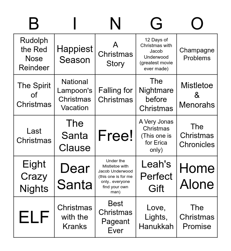 This bingo card has a free space and 29 words: ELF, The Grinch (Jim Carrey's version ONLY), The Santa Clause, The Polar Express, Rudolph the Red Nose Reindeer, A Christmas Story, National Lampoon's Christmas Vacation, Dear Santa, A Very Jonas Christmas (This one is for Erica only), Christmas with the Kranks, The Christmas Chronicles, The Christmas Promise, Best Christmas Pageant Ever, Love, Lights, Hanukkah, Mistletoe & Menorahs, Double Holiday, Under the Mistletoe with Jacob Underwood (this one is for me only.. everyone find your own man), Eight Crazy Nights, Champagne Problems, Last Christmas, Leah's Perfect Gift, Hanukkah on the Rocks, The Nightmare before Christmas, The Spirit of Christmas, 12 Days of Christmas with Jacob Underwood (greatest movie ever made), Happiest Season, Home Alone, Falling for Christmas and Round and Round.