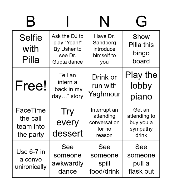 This bingo card has 16 words: See someone awkwardly dance, Get an attending to buy you a sympathy drink, Have Dr. Sandberg introduce himself to you, Selfie with Pilla, FaceTime the call team into the party, Ask the DJ to play “Yeah!” By Usher to see Dr. Gupta dance, Interrupt an attending conversation for no reason, See someone spill food/drink, Free!, Tell an intern a “back in my day…” story, Use 6-7 in a convo unironically, Show Pilla this bingo board, Try every dessert, Play the lobby piano, Drink or run with Yaghmour and See someone pull a flask out.