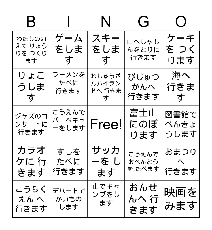 This bingo card has a free space and 29 words: こうらくえん へ 行きます, うまに のります, こうえんで バーベキューをします, つりをします, わたしのいえで りょうりを つくります, スキーをします, ラーメンを たべに 行きます, すしを たべに 行きます, 富士山にのぼります, デパートで かいもの します, 図書館で べんきょうします, 映画をみます, 山でキャンプをします, おんせんへ 行きます, 海へ 行きます, ドライブに 行きます, サッカーを します, カラオケに 行きます, ケーキを つくります, ジャズのコンサートに行きます, こうえんで おべんとうを たべます, DVDをみます, びじゅつかんへ 行きます, りょこうします, 山へしゃしんをとりに行きます, ゲームをします, おまつりへ 行きます, わしゅうざんハイランドへ 行きます and テニスをします.
