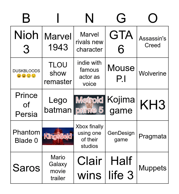 This bingo card has 1 images, a free space and 24 words: Kingsfield, Mario Galaxy movie trailer, indie with famous actor as voice, Saros, Assassin's Creed, Nioh 3, DUSKBLOODS😫😫🤤🤤, Marvel 1943, Kojima game, Xbox finally using one of their studios, Mouse P.I, Prince of Persia, GenDesign game, Pragmata, TLOU show remaster, Half life 3, KH3, Marvel rivals new character, Wolverine, Lego batman, Muppets, Phantom Blade 0, GTA 6 and Clair wins.