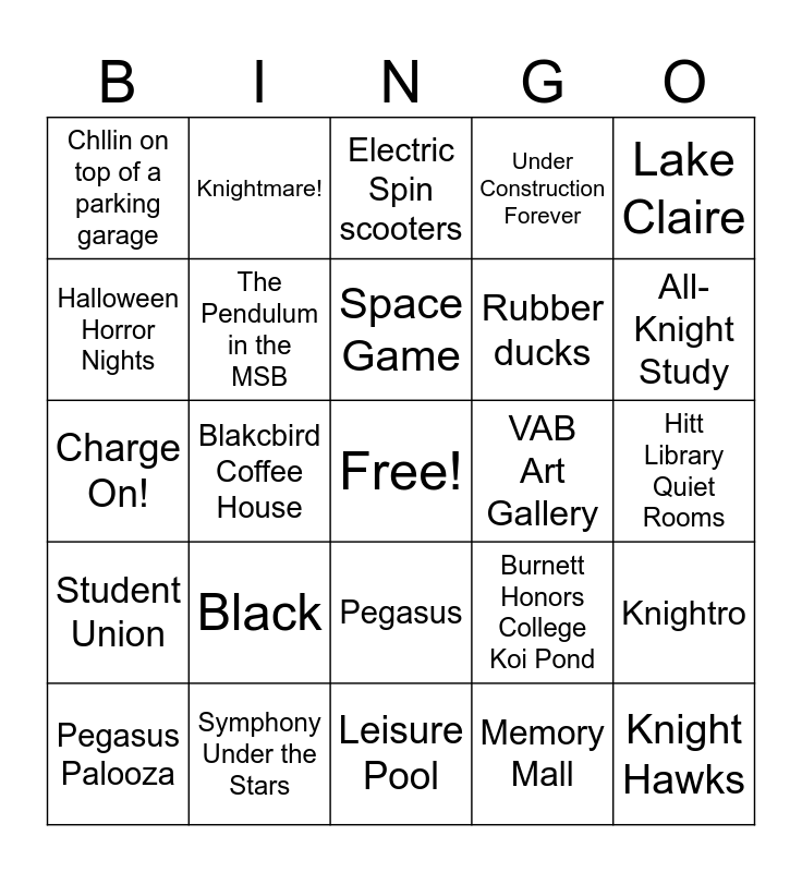 This bingo card has a free space and 42 words: Bounce House, Space Game, Gold, Black, Memory Mall, Knightro, Knight Hawks, Arboretum, Electric Spin scooters, Pegasus, Hitt Library Quiet Rooms, All-Knight Study, Blakcbird Coffee House, Lake Claire, Expensive Parking Space, Burnett Honors College Koi Pond, Hurricane Nicole, Charge On!, Go Knights!, Knightmare!, Halloween Horror Nights, Towers dorms, Homecoming week concert, Chllin on top of a parking garage, Mannequins drag shows, Spirit Splash, Rubber ducks, Citronauts, Call the RA, GroupMe chats, Racoons on the boardwalk, Student Union, The Pendulum in the MSB, Leisure Pool, Cyclorama Sculptures, Pegasus Palooza, Symphony Under the Stars, VAB Art Gallery, Pegasus Seal, Florida Technological U, Under Construction Forever and U Can't Finish.