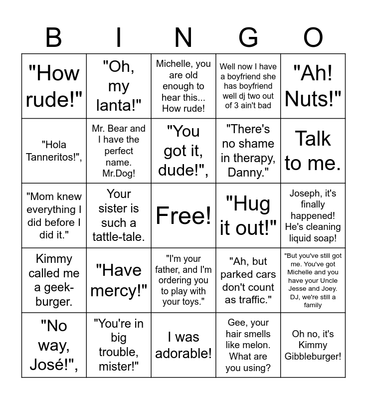 This bingo card has a free space and 24 words: "Have mercy!", "You're in big trouble, mister!", "You got it, dude!",, "No way, José!",, "Ah! Nuts!", "How rude!", "Hola Tanneritos!",, "Oh, my lanta!", "Hug it out!", "I'm your father, and I'm ordering you to play with your toys.", "There's no shame in therapy, Danny.", "Mom knew everything I did before I did it.", "Ah, but parked cars don't count as traffic.", "But you've still got me. You've got Michelle and you have your Uncle Jesse and Joey. DJ, we're still a family, Mr. Bear and I have the perfect name. Mr.Dog!, Gee, your hair smells like melon. What are you using?, Joseph, it's finally happened! He's cleaning liquid soap!, Michelle, you are old enough to hear this... How rude!, Talk to me., Your sister is such a tattle-tale., Oh no, it's Kimmy Gibbleburger!, Kimmy called me a geek-burger., Well now I have a boyfriend she has boyfriend well dj two out of 3 ain't bad and I was adorable!.