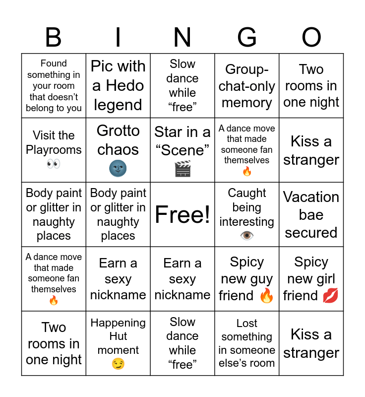 This bingo card has a free space and 50 words: Body shot, Kiss a stranger, Spank or be spanked, Slow dance while βfreeβ, Earn a sexy nickname, Invited to a private party, Pic with a Hedo legend, Break someone out of their shell, Visit the Playrooms π, Happening Hut moment π, Grotto chaos π, Group-chat-only memory, Spicy new girl friend π, Spicy new guy friend π₯, Vacation bae secured, Ceiling pic proof πΈ, Star in a βSceneβ π¬, Caught being interesting ποΈ, Fantasy crossed off βοΈ, Two rooms in one night, Body paint or glitter in naughty places, Lost something in someone elseβs room, Found something in your room that doesnβt belong to you, A dance move that made someone fan themselves π₯, Wardrobe malfunction you just rolled with π, Body shot, Kiss a stranger, Spank or be spanked, Slow dance while βfreeβ, Earn a sexy nickname, Invited to a private party, Pic with a Hedo legend, Break someone out of their shell, Visit the Playrooms π, Happening Hut moment π, Grotto chaos π, Group-chat-only memory, MFF π, MFM π₯, Vacation bae secured, Ceiling pic proof πΈ, Star in a βSceneβ π¬, Caught being interesting ποΈ, Fantasy crossed off βοΈ, Two rooms in one night, Body paint or glitter in naughty places, Lost something in someone elseβs room, Found something in your room that doesnβt belong to you, A dance move that made someone fan themselves π₯ and Wardrobe malfunction you just rolled with π.