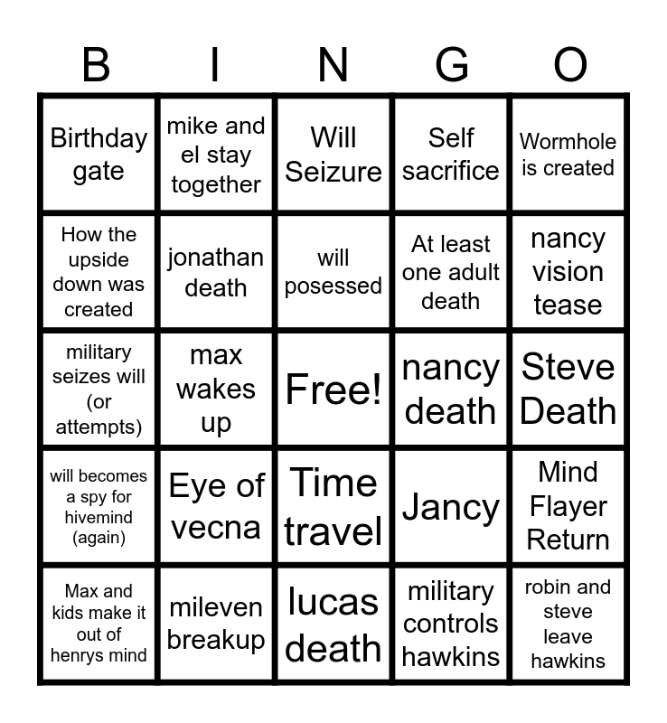 This bingo card has a free space and 24 words: Eye of vecna, mileven breakup, will posessed, Max and kids make it out of henrys mind, Wormhole is created, Birthday gate, How the upside down was created, mike and el stay together, nancy death, Time travel, At least one adult death, military seizes will (or attempts), Jancy, Mind Flayer Return, jonathan death, military controls hawkins, Steve Death, Will Seizure, nancy vision tease, max wakes up, robin and steve leave hawkins, will becomes a spy for hivemind (again), Self sacrifice and lucas death.