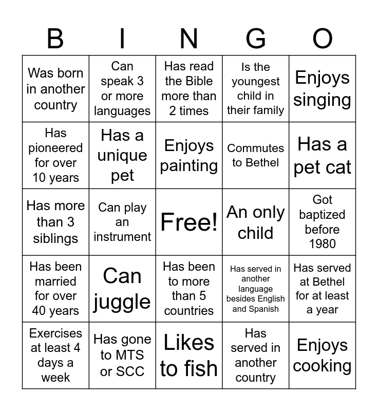 This bingo card has a free space and 24 words: Can juggle, Has gone to MTS or SCC, Enjoys painting, Exercises at least 4 days a week, Enjoys singing, Was born in another country, Has pioneered for over 10 years, Can speak 3 or more languages, An only child, Has been to more than 5 countries, Commutes to Bethel, Has more than 3 siblings, Has served in another language besides English and Spanish, Has served at Bethel for at least a year, Has a unique pet, Has served in another country, Got baptized before 1980, Has read the Bible more than 2 times, Has a pet cat, Can play an instrument, Enjoys cooking, Has been married for over 40 years, Is the youngest child in their family and Likes to fish.