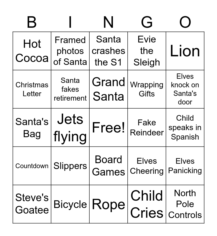 This bingo card has a free space and 24 words: Slippers, Bicycle, Grand Santa, Steve's Goatee, Lion, Hot Cocoa, Christmas Letter, Framed photos of Santa, Fake Reindeer, Board Games, Wrapping Gifts, Santa's Bag, Elves Cheering, Elves Panicking, Santa fakes retirement, Child Cries, Child speaks in Spanish, Santa crashes the S1, Elves knock on Santa's door, Jets flying, North Pole Controls, Countdown, Evie the Sleigh and Rope.