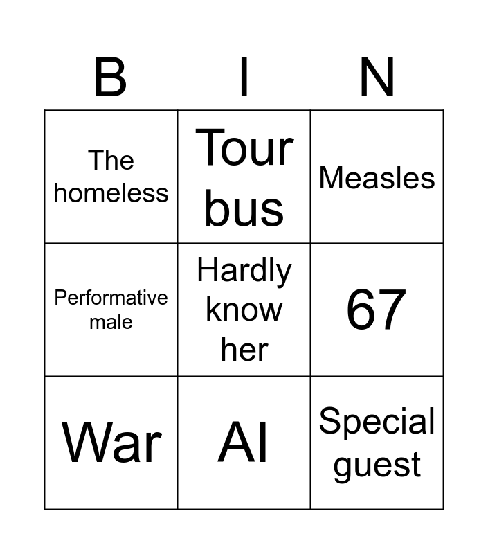 This bingo card has a free space and 8 words: 67, Measles, Tour bus, War, The homeless, Special guest, Performative male and AI.