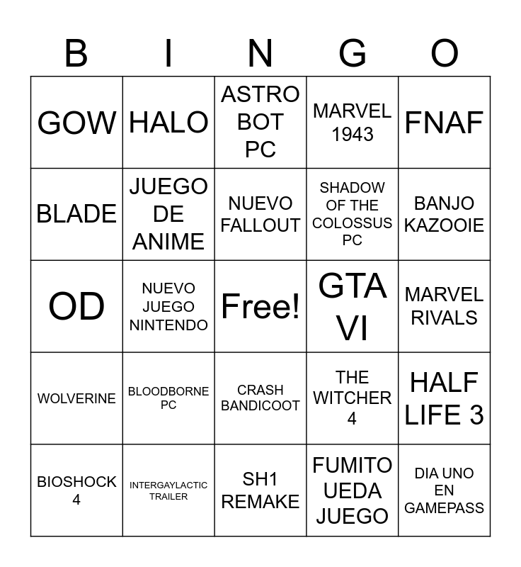 This bingo card has a free space and 24 words: BLOODBORNE PC, INTERGAYLACTIC TRAILER, NUEVO FALLOUT, BIOSHOCK 4, FNAF, GOW, BLADE, HALO, GTA VI, CRASH BANDICOOT, SHADOW OF THE COLOSSUS PC, OD, THE WITCHER 4, HALF LIFE 3, JUEGO DE ANIME, FUMITO UEDA JUEGO, MARVEL RIVALS, ASTRO BOT PC, BANJO KAZOOIE, NUEVO JUEGO NINTENDO, DIA UNO EN GAMEPASS, WOLVERINE, MARVEL 1943 and SH1 REMAKE.