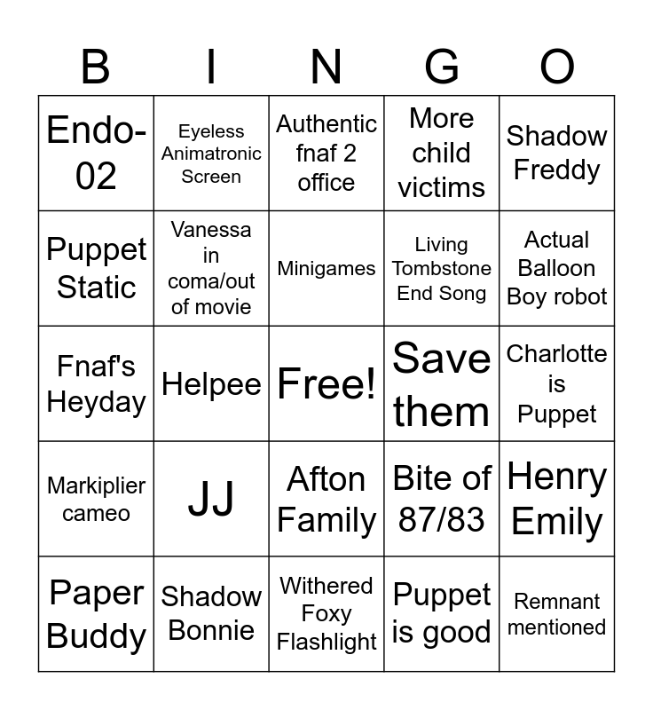 This bingo card has a free space and 24 words: JJ, Shadow Bonnie, Minigames, Paper Buddy, Shadow Freddy, Endo-02, Puppet Static, Eyeless Animatronic Screen, Save them, Afton Family, Living Tombstone End Song, Fnaf's Heyday, Bite of 87/83, Henry Emily, Vanessa in coma/out of movie, Puppet is good, Charlotte is Puppet, Authentic fnaf 2 office, Actual Balloon Boy robot, Helpee, Remnant mentioned, Markiplier cameo, More child victims and Withered Foxy Flashlight.