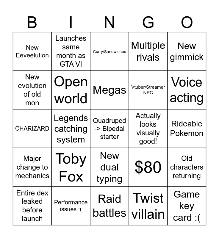 This bingo card has a free space and 24 words: Toby Fox, Performance issues :(, Megas, Entire dex leaked before launch, New gimmick, New Eeveelution, New evolution of old mon, Launches same month as GTA VI, Actually looks visually good!, New dual typing, Vtuber/Streamer NPC, CHARIZARD, $80, Old characters returning, Open world, Twist villain, Rideable Pokemon, Curry/Sandwiches, Voice acting, Legends catching system, Game key card :(, Major change to mechanics, Multiple rivals and Raid battles.