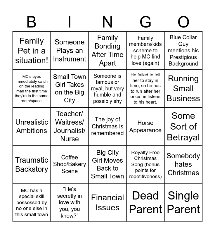 This bingo card has a free space and 30 words: "He's secretly in love with you, you know?", Someone works in business, Teacher/ Waitress/ Journalist/ Nurse, Accidentally caught under a mistletoe, Family Pet in a situation!, Family Bonding After Time Apart, Small Town Girl Takes on the Big City, Big City Girl Moves Back to Small Town, Horse Appearance, Financial Issues, Some Sort of Betrayal, Single Parent, Dead Parent, Dramatic Issue that would NEVER actually become a problem, Running Small Business, Motel/Hotel/Inn, Royalty Free Christmas Song (bonus points for repetitiveness), Traumatic Backstory, Coffee Shop/Bakery Scene, Blue Collar Guy mentions his Prestigious Background, Unrealistic Ambitions, Weird Family Tradition, Someone Plays an Instrument, He failed to tell her to stay in time, so he has to run after her once he listens to his heart., MC's eyes immediately catch on the leading man the first time they're in the same room/space., Family members/kids scheme to help MC find love (again), Somebody hates Christmas, MC has a special skill possessed by no one else in this small town, Someone is famous or royal, but very humble and possibly shy and Bad Set.