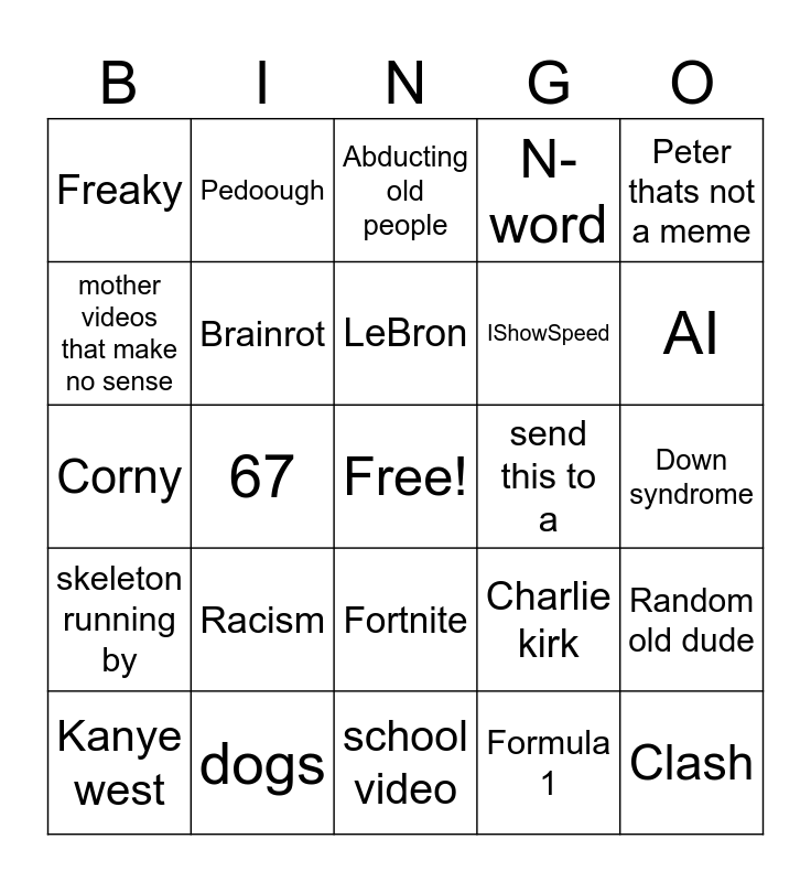 This bingo card has a free space and 24 words: Kanye west, Racism, LeBron, Formula 1, Peter thats not a meme, Freaky, Pedoough, Abducting old people, send this to a, Down syndrome, Corny, Brainrot, Charlie kirk, Random old dude, mother videos that make no sense, dogs, school video, N-word, AI, skeleton running by, 67, Fortnite, IShowSpeed and Clash.