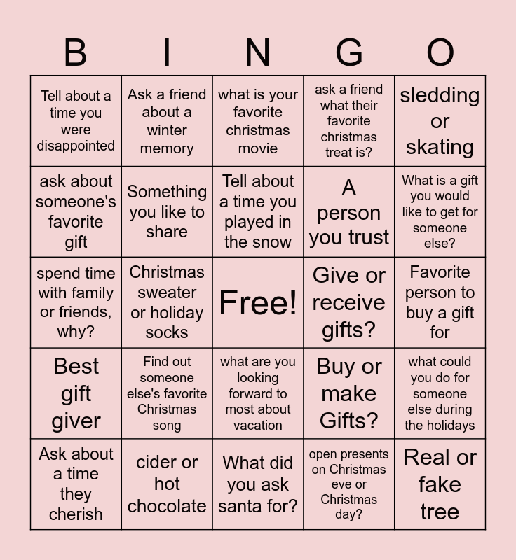 This bingo card has a free space and 24 words: Find out someone else's favorite Christmas song, cider or hot chocolate, Tell about a time you played in the snow, Ask about a time they cherish, sledding or skating, Tell about a time you were disappointed, ask about someone's favorite gift, Ask a friend about a winter memory, Give or receive gifts?, what are you looking forward to most about vacation, A person you trust, spend time with family or friends, why?, Buy or make Gifts?, what could you do for someone else during the holidays, Something you like to share, open presents on Christmas eve or Christmas day?, Favorite person to buy a gift for, what is your favorite christmas movie, What is a gift you would like to get for someone else?, Christmas sweater or holiday socks, Real or fake tree, Best gift giver, ask a friend what their favorite christmas treat is? and What did you ask santa for?.