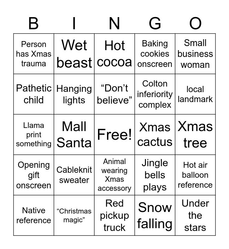This bingo card has a free space and 26 words: Animal wearing Xmas accessory, Snow falling, “Don’t believe”, “Christmas magic”, Small business woman, Person has Xmas trauma, Pathetic child, Wet beast, Xmas tree, Jingle bells plays, Colton inferiority complex, Llama print something, Hot air balloon reference, Native reference, Mall Santa, Rudolph joke, Baking cookies onscreen, Opening gift onscreen, Hot cocoa, Under the stars, local landmark, Red pickup truck, Xmas cactus, Cableknit sweater, Hanging lights and Angels.