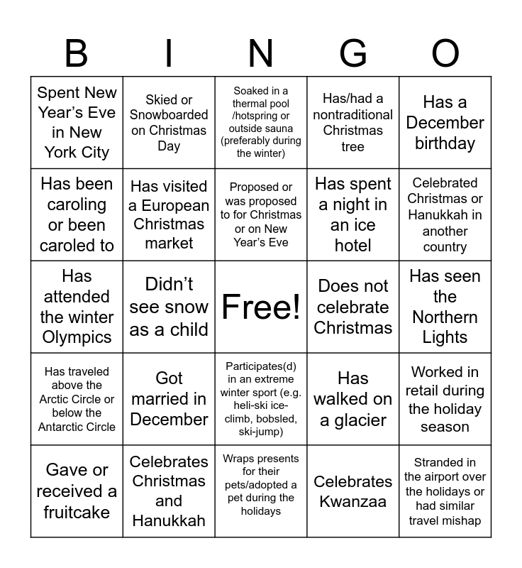 This bingo card has a free space and 24 words: Got married in December, Celebrates Christmas and Hanukkah, Proposed or was proposed to for Christmas or on New Year’s Eve, Gave or received a fruitcake, Has a December birthday, Spent New Year’s Eve in New York City, Has been caroling or been caroled to, Skied or Snowboarded on Christmas Day, Does not celebrate Christmas, Participates(d) in an extreme winter sport (e.g. heli-ski ice-climb, bobsled, ski-jump), Has spent a night in an ice hotel, Has attended the winter Olympics, Has walked on a glacier, Worked in retail during the holiday season, Has visited a European Christmas market, Celebrates Kwanzaa, Has seen the Northern Lights, Soaked in a thermal pool /hotspring or outside sauna (preferably during the winter), Celebrated Christmas or Hanukkah in another country, Didn’t see snow as a child, Stranded in the airport over the holidays or had similar travel mishap, Has traveled above the Arctic Circle or below the Antarctic Circle, Has/had a nontraditional Christmas tree and Wraps presents for their pets/adopted a pet during the holidays.
