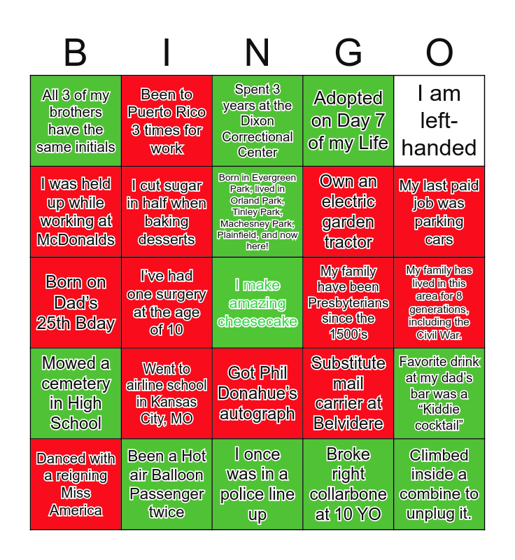 This bingo card has 27 words: Substitute mail carrier at Belvidere, Climbed inside a combine to unplug it., Own an electric garden tractor, I once was in a police line up, I was held up while working at McDonalds, Spent 3 years at the Dixon Correctional Center, Been to Puerto Rico 3 times for work, Mowed a cemetery in High School, My family have been Presbyterians since the 1500’s, Favorite drink at my dad’s bar was a “Kiddie cocktail”, Born on Dad’s 25th Bday, Adopted on Day 7 of my Life, Danced with a reigning Miss America, Been a Hot air Balloon Passenger twice, My last paid job was parking cars, Dad died when was I was 12 YO, I cut sugar in half when baking desserts, Born in Evergreen Park, lived in Orland Park, Tinley Park, Machesney Park, Plainfield, and now here!, Went to airline school in Kansas City, MO, All 3 of my brothers have the same initials, My family has lived in this area for 8 generations, including the Civil War., Broke right collarbone at 10 YO, I’ve had one surgery at the age of 10, I make amazing cheesecake, Got Phil Donahue’s autograph, I am left-handed and I have been to Alaska 4 times.