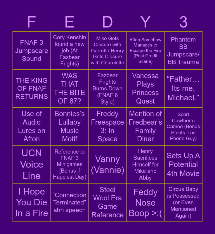 This bingo card has a free space and 24 words: Reference to FNAF 3 Minigames (Bonus if Happiest Day), “Connection Terminated” ahh speech, Fazbear Frights Burns Down (FNAF 6 Style), I Hope You Die In a Fire, Phantom BB Jumpscare/ BB Trauma, FNAF 3 Jumpscare Sound, THE KING OF FNAF RETURNS, Cory Kenshin found a new job (At Fazbear Frights), Mention of Fredbear’s Family Diner, Vanny (Vannie), Vanessa Plays Princess Quest, Use of Audio Lures on Afton, Henry Sacrifices Himself for Mike and Abby, Sets Up A Potential 4th Movie, WAS THAT THE BITE OF 87?, Feddy Nose Boop >:(, Scort Cawthorm Cameo (Bonus Points if as Phone Guy), Mike Gets Closure with Garrett / Henry Gets Closure with Charolette, “Father… Its me, Michael.”, Bonnies’s Lullaby Music Motif, Circus Baby is Possessed (or Even Mentioned Again), UCN Voice Line, Afton Somehow Manages to Escape the Fire (Post Credit Scene) and Steel Wool Era Game Reference.