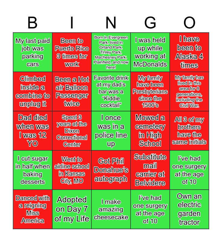 This bingo card has 27 words: Substitute mail carrier at Belvidere, Own an electric garden tractor, My family have been Presbyterians since the 1500’s, I make amazing cheesecake, Climbed inside a combine to unplug it, Born in Evergreen Park, lived in Orland Park, Tinley Park, Machesney Park, Plainfield, and now here!, Been to Puerto Rico 3 times for work, I cut sugar in half when baking desserts, Mowed a cemetery in High School, I’ve had one surgery at the age of 10, Dad died when was I was 12 YO, I was held up while working at McDonalds, Danced with a reigning Miss America, Adopted on Day 7 of my Life, My family has lived in this area for 8 generations, including the Civil War., Broke right collarbone at 10 YO, Been a Hot air Balloon Passenger twice, Favorite drink at my dad’s bar was a “Kiddie cocktail”, Went to airline school in Kansas City, MO, My last paid job was parking cars, All 3 of my brothers have the same initials, I’ve had one surgery at the age of 10, Spent 3 years at the Dixon Correctional Center, I once was in a police line up, Got Phil Donahue’s autograph, I have been to Alaska 4 times and I am left-handed.