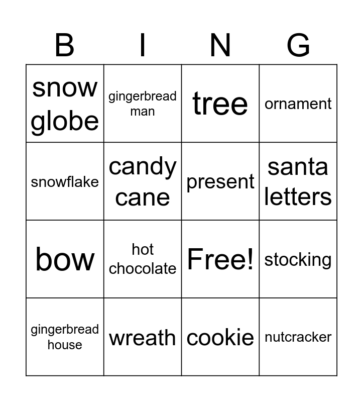 This bingo card has 19 words: Free!, snowman, tree, nutcracker, stocking, snowflake, cookie, snow globe, gingerbread man, bow, hot chocolate, candy cane, present, wreath, gingerbread house, reindeer, ornament, santa letters and santa face.