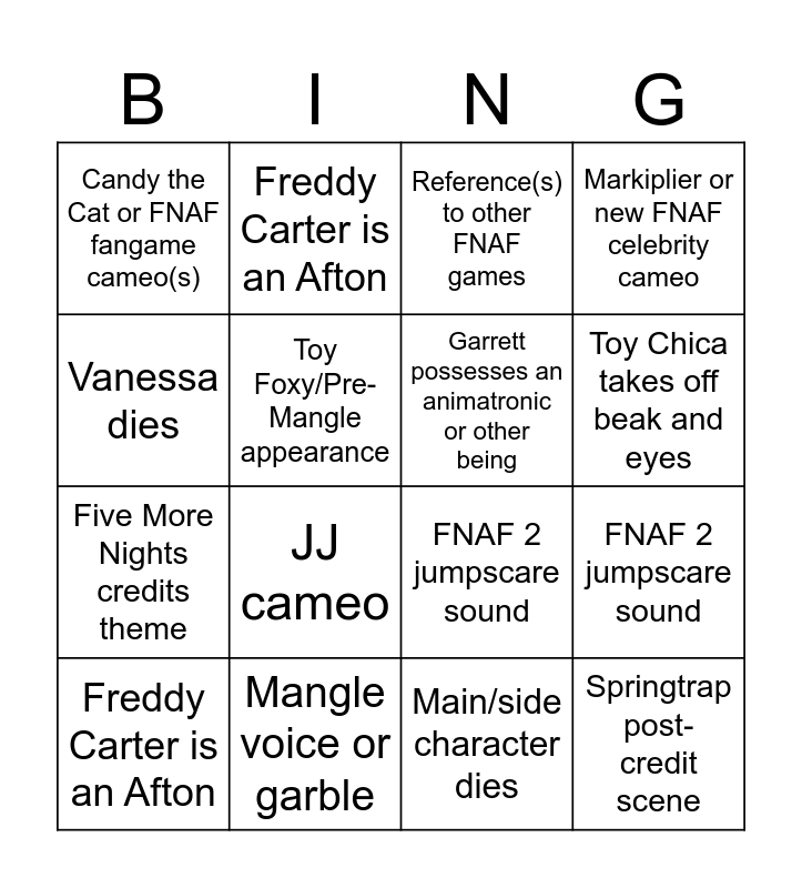 This bingo card has 21 words: Mangle voice or garble, William Afton learning about soul remnant, Freddy Carter is an Afton, FNAF meme reference, Main/side character dies, Garrett possesses an animatronic or other being, Candy the Cat or FNAF fangame cameo(s), Reference(s) to other FNAF games, FNAF 2 jumpscare sound, Toy Chica takes off beak and eyes, Five More Nights credits theme, Markiplier or new FNAF celebrity cameo, Springtrap post-credit scene, JJ or Shadow Bonnie cameo, Toy Foxy/Pre-Mangle appearance, William Afton murders children flashback, Freddy Carter is an Afton, JJ cameo, Vanessa dies, FNAF 2 jumpscare sound and Toy Chica takes off beak and eyes.