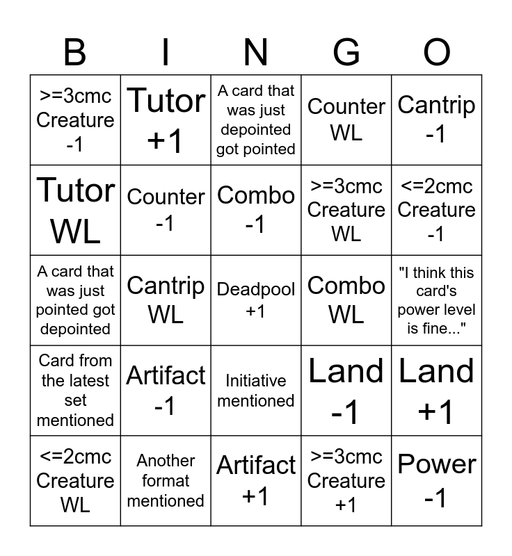 This bingo card has a free space and 49 words: Power +1, Power -1, Power WL, Artifact +1, Artifact -1, Artifact WL, Tutor +1, Tutor -1, Tutor WL, Counter +1, Counter -1, Counter WL, Land +1, Land -1, Land WL, Combo +1, Combo -1, Combo WL, Cantrip +1, Cantrip -1, Cantrip WL, >=3cmc Creature +1, >=3cmc Creature -1, >=3cmc Creature WL, <=2cmc Creature +1, <=2cmc Creature -1, <=2cmc Creature WL, Any PW mentioned, Initiative mentioned, Card from the latest set mentioned, Chat liked that change, Chat disliked that change, Someone in chat quits the format, Event announcement, Another format mentioned, A card received the "fun police" treatment, A meme is mentioned, "It's a difficult decision...", "I think this card's power level is fine...", "It's a matter of format health...", Dominant archetype in the format mentioned, Mention of a card being too iconic to point, Someone argues about the balance of x versus y, Accessibility mentioned, A card that was just pointed got depointed, A card that was just depointed got pointed, Power creep mentioned, Vape rip or drinking on stream and Mental misstep mentioned.