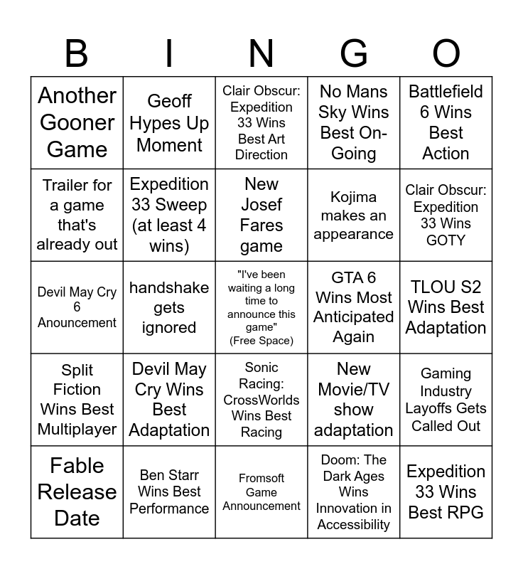 This bingo card has a free space and 44 words: A Remake of some 6th gen era game, Expedition 33 Wins Best RPG, Clair Obscur: Expedition 33 Wins Best Game Direction, Fable Release Date, Arc Raiders Wins Best Multiplayer, Doom: The Dark Ages Wins Innovation in Accessibility, Clair Obscur: Expedition 33 Wins Best Art Direction, Trailer for a game with no gameplay, Battlefield 6 Wins Best Action, Ben Starr Wins Best Performance, No Mans Sky Wins Best On-Going, GTA 6 Wins Most Anticipated Again, Sonic Racing: CrossWorlds Wins Best Racing, Devil May Cry Wins Best Adaptation, GTA 6 Trailer, Fromsoft Game Announcement, RGG Studio showing off again, Devil May Cry 6 Anouncement, Split Fiction Wins Best Family Game, Clair Obscur: Expedition 33 Wins GOTY, Geoff Hypes Up Moment, Death Stranding 2 port, Gaming Industry Layoffs Gets Called Out, Another Gooner Game, Nintendo Wins Best Family Game, TLOU S2 Wins Best Adaptation, technical difficulties, presenter misreads game title, New Movie/TV show adaptation, Split Fiction Wins Best Multiplayer, Capcom does something with another old IP, Gaming Industry Layoffs Gets Called Out, AI mention, Cryptic twitter teaser is a nothing burger, handshake gets ignored, 3+ hours long, GTA 6 trailer, New Mainline Pokemon game, New Josef Fares game, Trailer for a game that's already out, Kojima makes an appearance, Silksong DLC, Expedition 33 Sweep (at least 4 wins) and [GAME] is now in development.