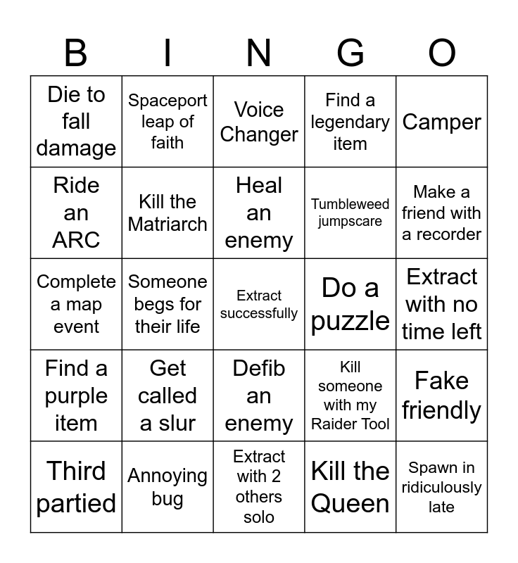 This bingo card has a free space and 24 words: Get called a slur, Annoying bug, Heal an enemy, Third partied, Camper, Die to fall damage, Ride an ARC, Spaceport leap of faith, Do a puzzle, Defib an enemy, Tumbleweed jumpscare, Complete a map event, Kill someone with my Raider Tool, Fake friendly, Kill the Matriarch, Kill the Queen, Extract with no time left, Voice Changer, Make a friend with a recorder, Someone begs for their life, Spawn in ridiculously late, Find a purple item, Find a legendary item and Extract with 2 others solo.